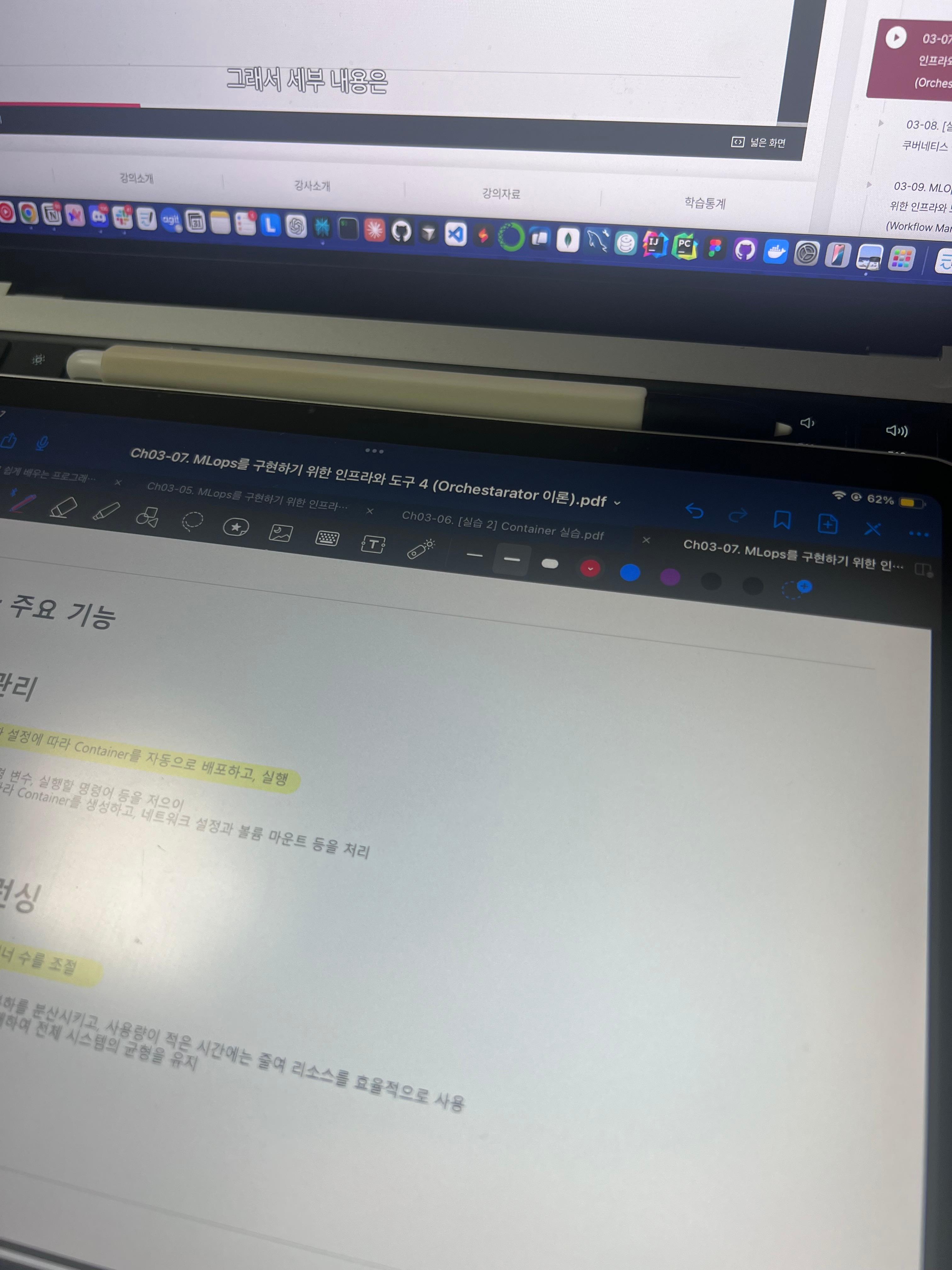 오늘은 Chapter Part.2 머신러닝 상품화 내용에서 수많은 컨테이너를 관리하기 위한 컨테이너 오케스트레이션에 대한 내용과 그 기술의 표준인 쿠버네티스에 대해서 알아보았습니다. 이러한 내용 같은 경우는 도커 컨테이너가 수백, 수천개로 늘어나면 사람이 일일이 수동으로 관리하는 것은 사실상 불가능 합니다. 이때 오케스트레이션 도구를 사용하는데 여러가지 기능을 자동화 한다고 합니다.