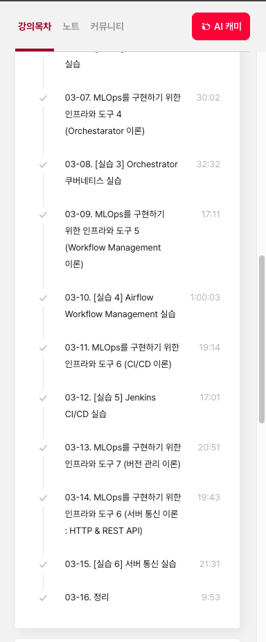 이런 실습후에, 전반적인 MLOps의 인프라 내용을 복습해보면서 여러가지 구성요소들에 대해서 다시 리마인드를 해보았습니다. Storage/Computing, 환경 관리 도구, Container개념, Orchestrator(K8s), 여러 워크플로우(Airflow), CI/CD 도구, 버전(형상)관리 도구, 그리고 이러한 요소들을 연결하는 HTTP 통신들에 대해서도 알아보았습니다.