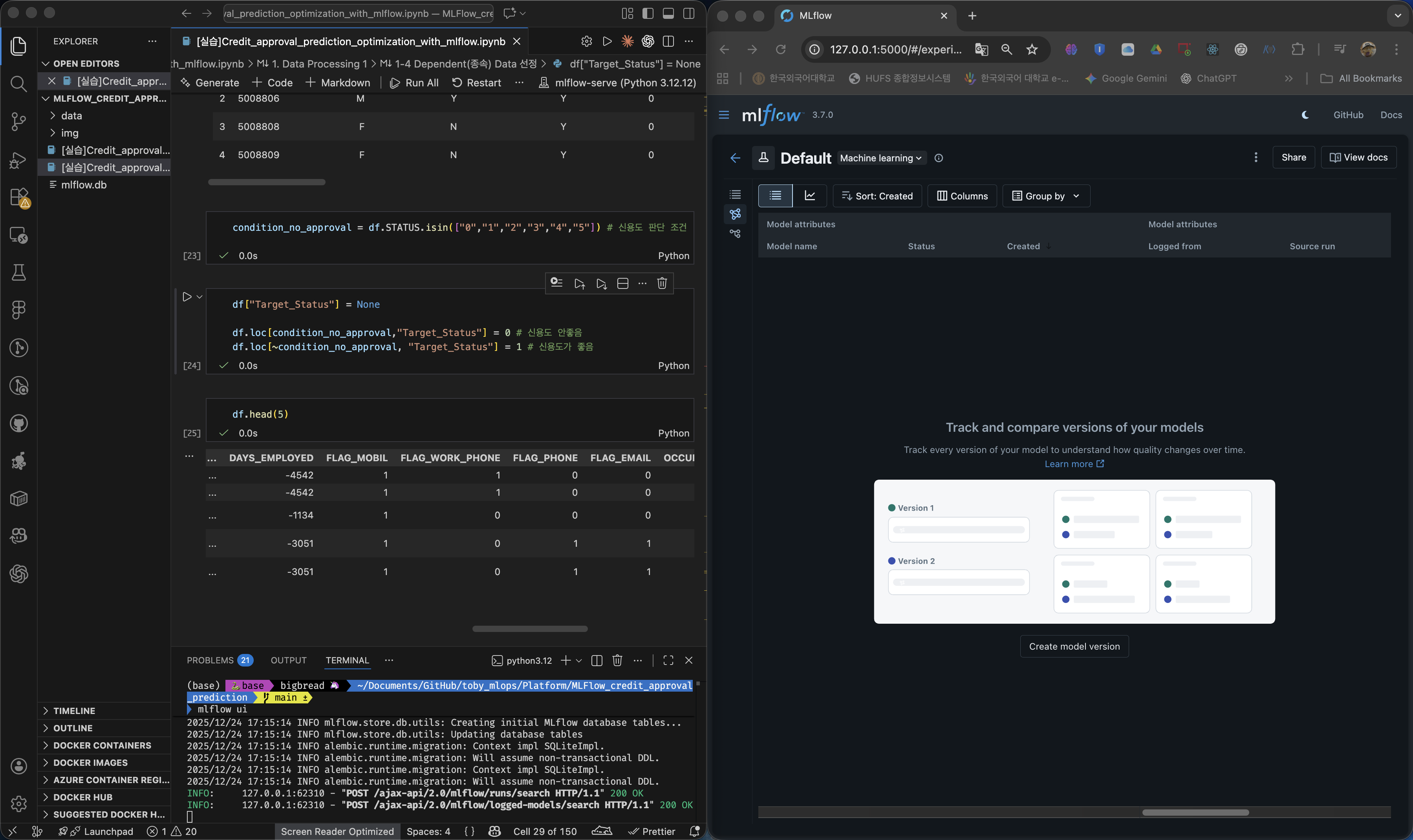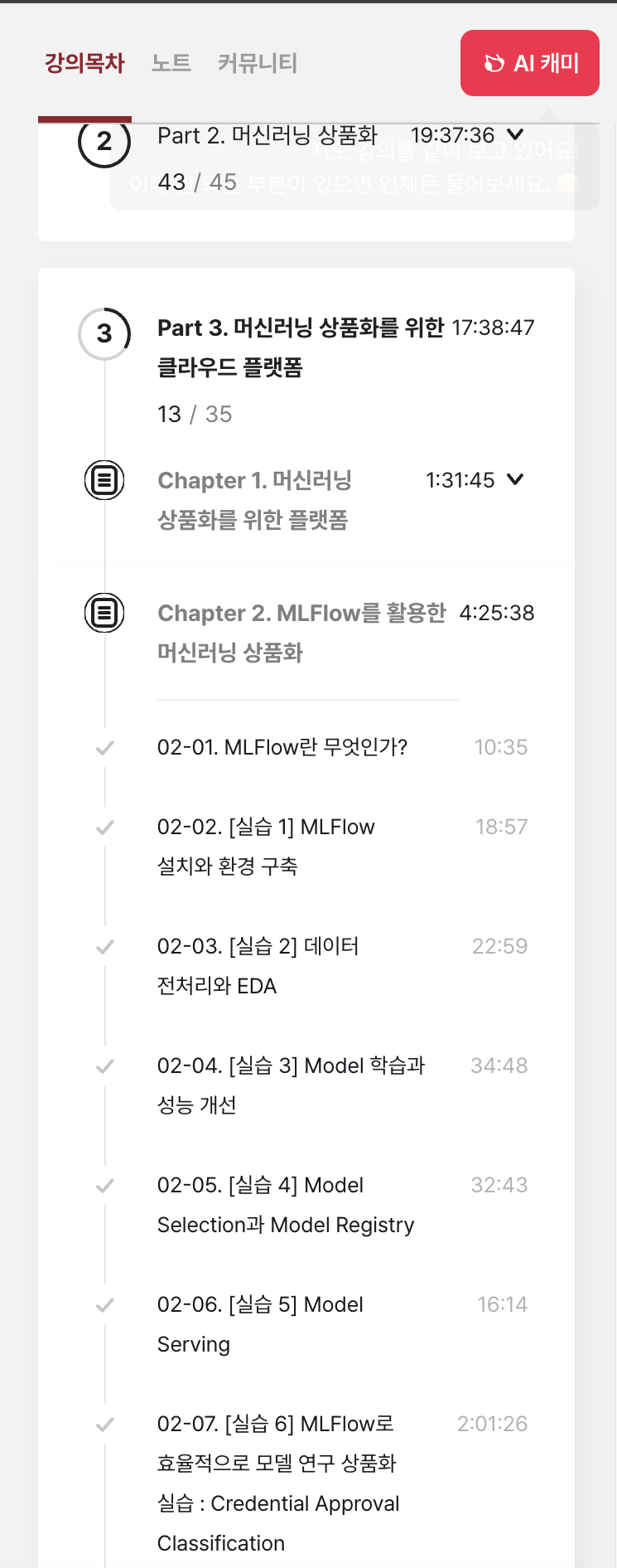 오늘은 MLOps 구축을 위해 주로 사용되는 플랫폼들 중에서 제일 먼저 사용되는 머신러닝 모델의 개발부터 배포까지 전체 수명 주기(LifeCycle)을 관리하는 오픈소스 플랫폼인 MLFlow(02-07) 실습을 해보면서 MLflow를 활용한 전체 end-to-end 프로세스를 실습해 보았습니다.