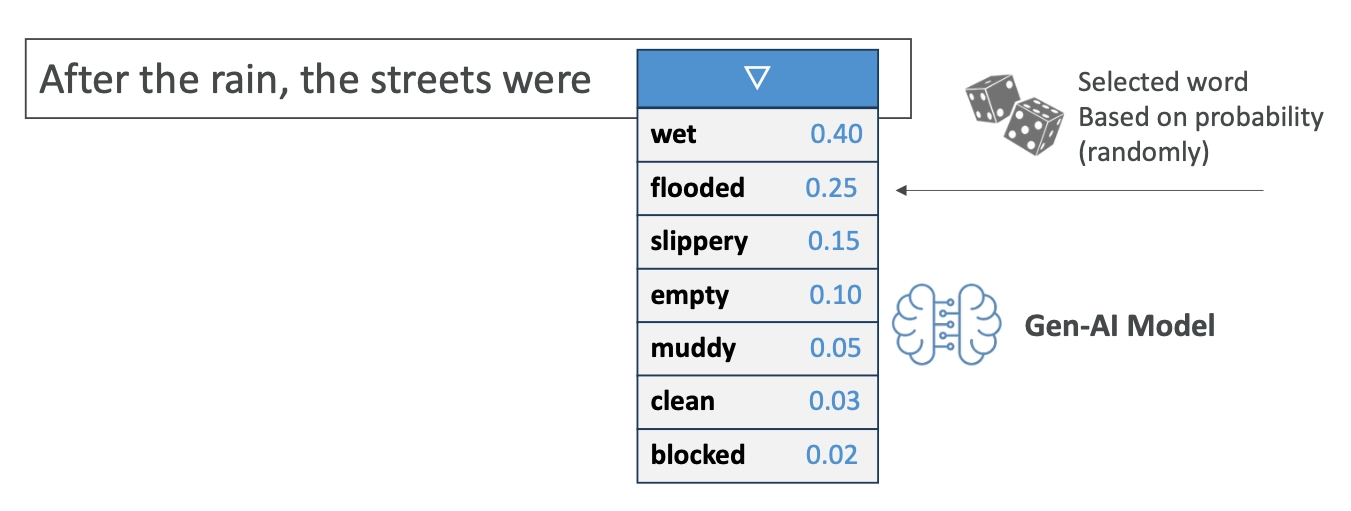 ๋ชจ๋ธ์ ๋ค์ ๋จ์ด ํ๋ณด๋ฅผ ๊ณ์ฐํฉ๋๋ค. ๊ทธ๋ฆฌ๊ณ ์ด ์ค ํ๋๋ฅผ ํ๋ฅ ์ ์ผ๋ก ์ ํํฉ๋๋ค.