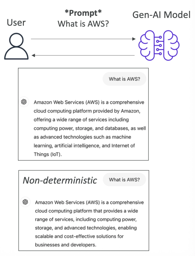 LLM์ ์ถ๋ ฅ์ ํญ์ ๋์ผํ์ง ์์ต๋๋ค. ๊ฐ์ ์ง๋ฌธ์ ํด๋ ๋ต๋ณ์ด ์กฐ๊ธ์ฉ ๋ฌ๋ผ์ง ์ ์์ต๋๋ค. ์: “What is AWS?”